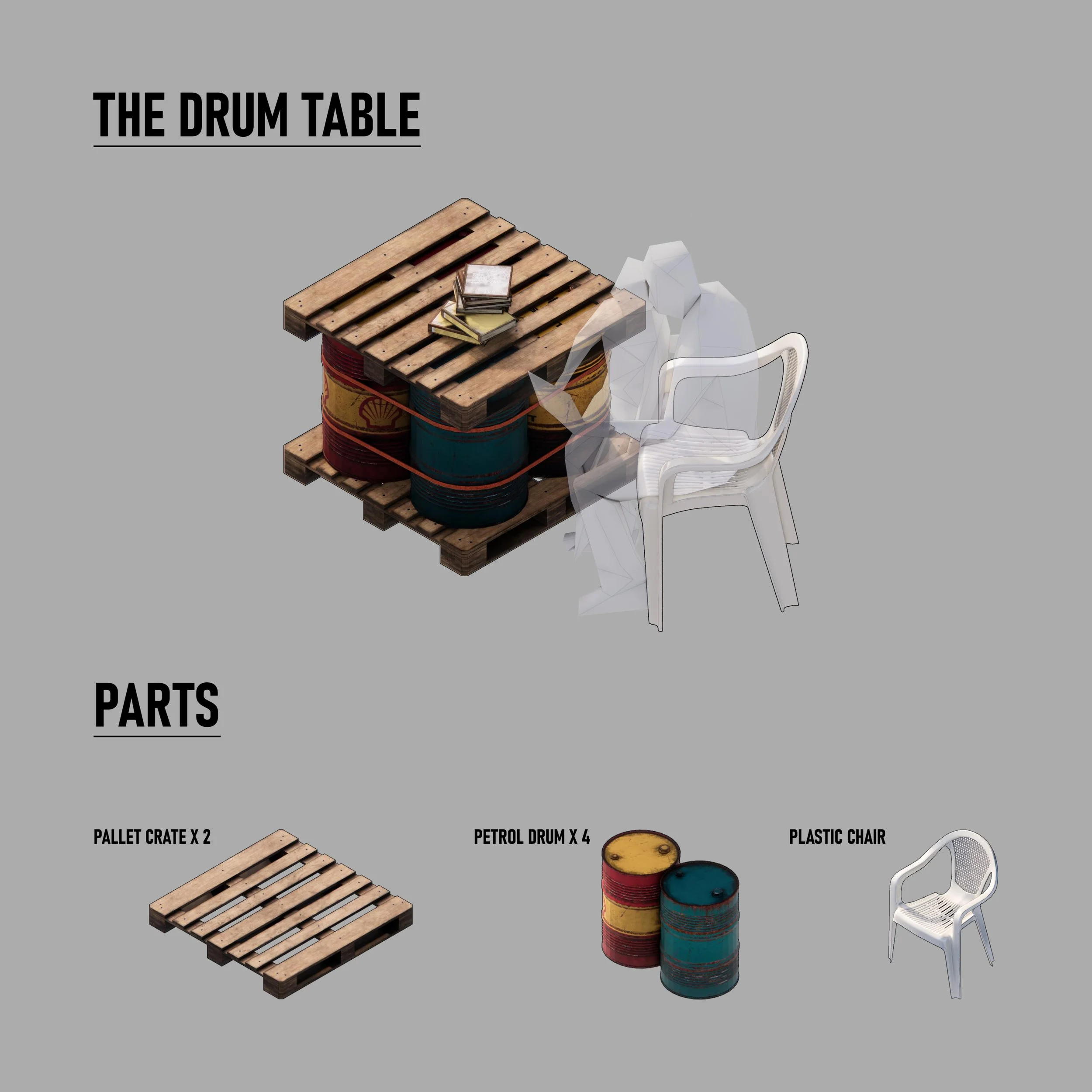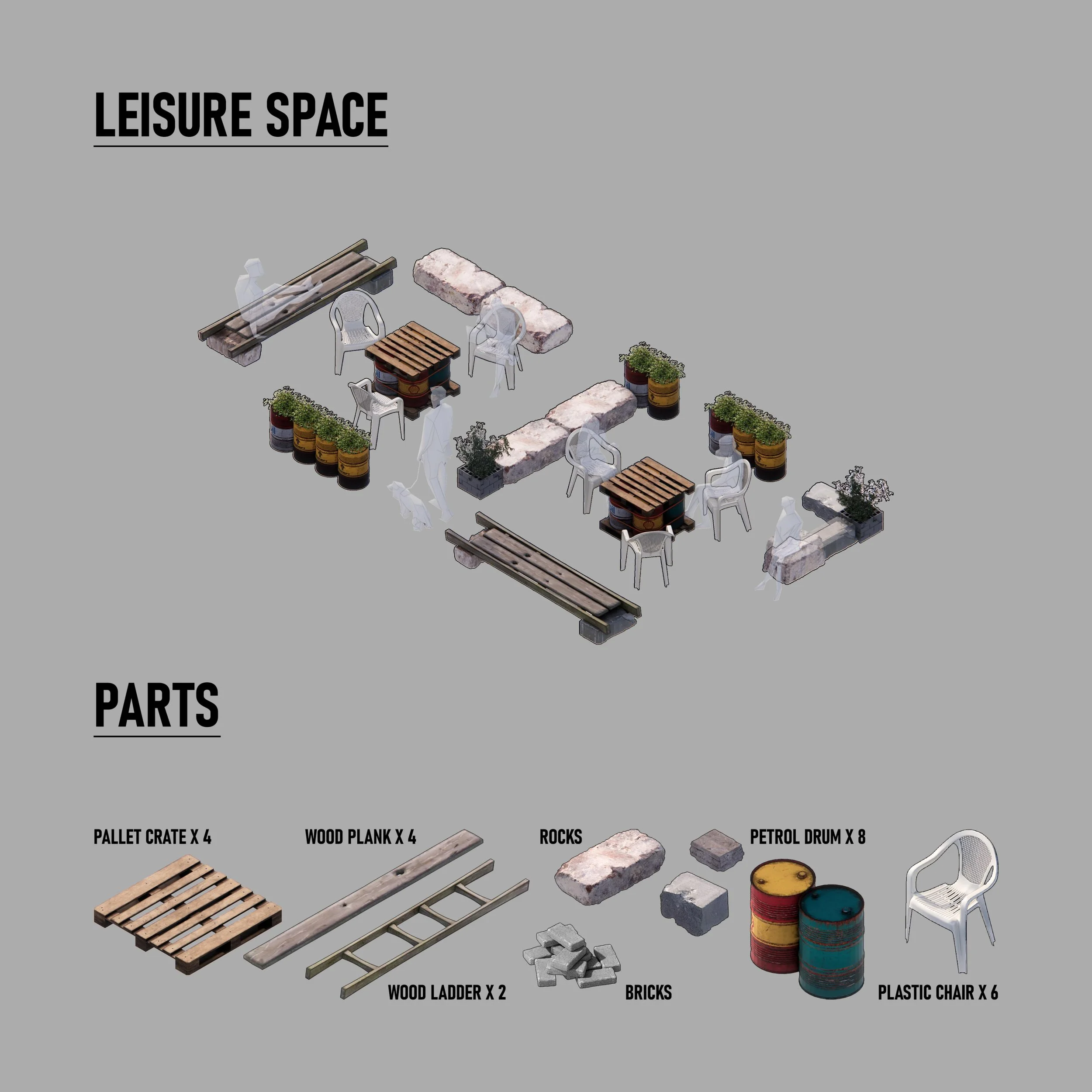 To achieve a piece of 'city interventions', each structure shall contain at least one structural material, such as steel, old oil drums, concrete, and bricks. Added to that foundation, people will have multiple choices depending on the found materials and the structure they would like to build. For instance, stone is a structural material, and wood pieces can be added to build a bench for people to rest. To ensure a certain level of aesthetics and some practical functions of each design, it is necessary to achieve a diversified combination of recyclable materials to achieve complementarity of function and shape and highlight the artistry of the structure. On a larger scale, these wastes are produced by the 'experience' of the city, which holds rich culture, and stories and create a vision for future resistance practices.