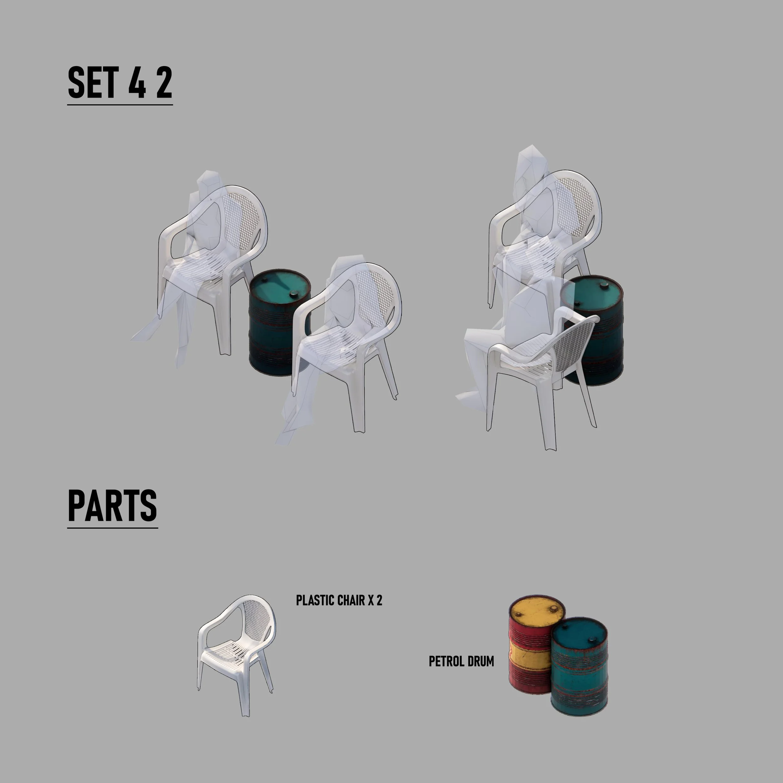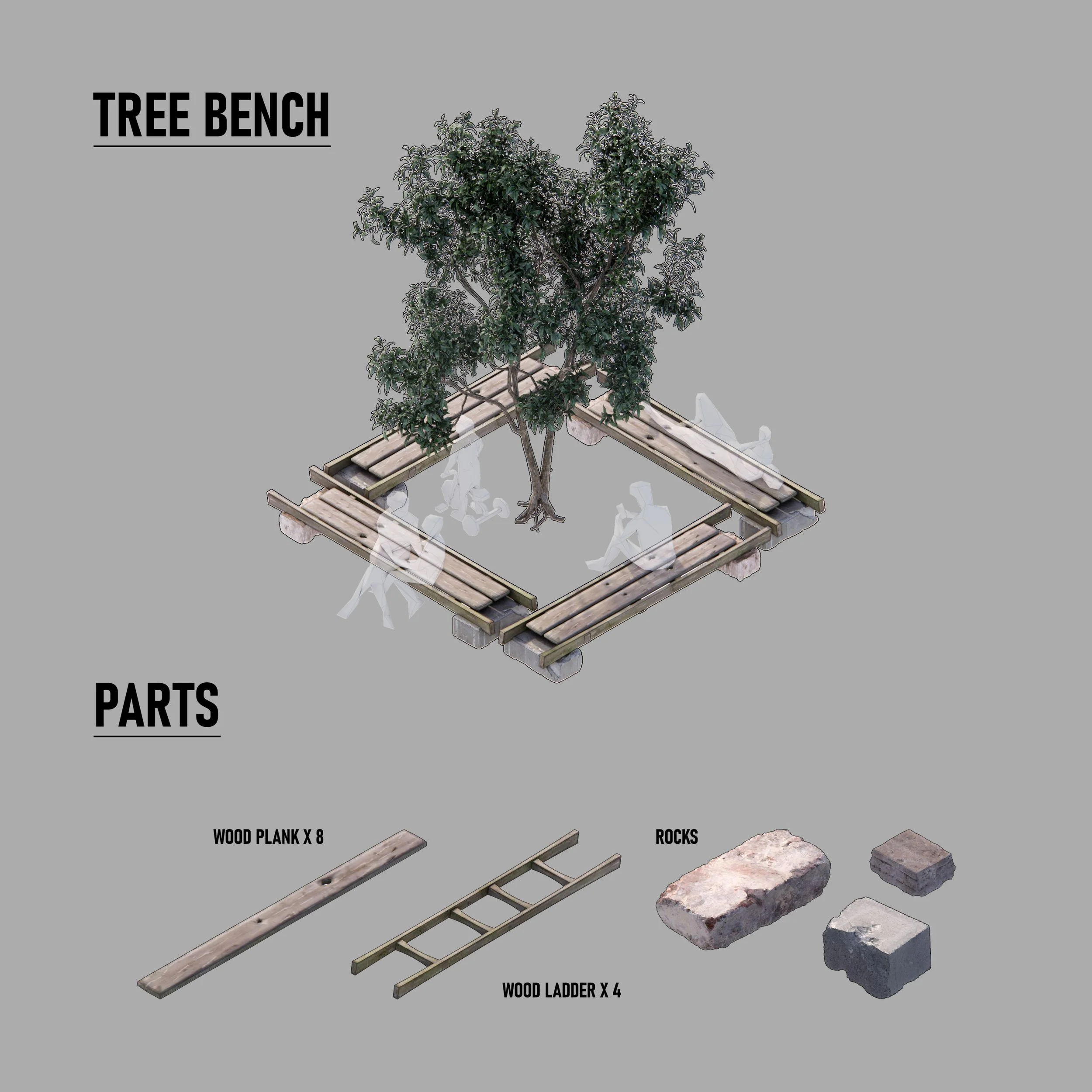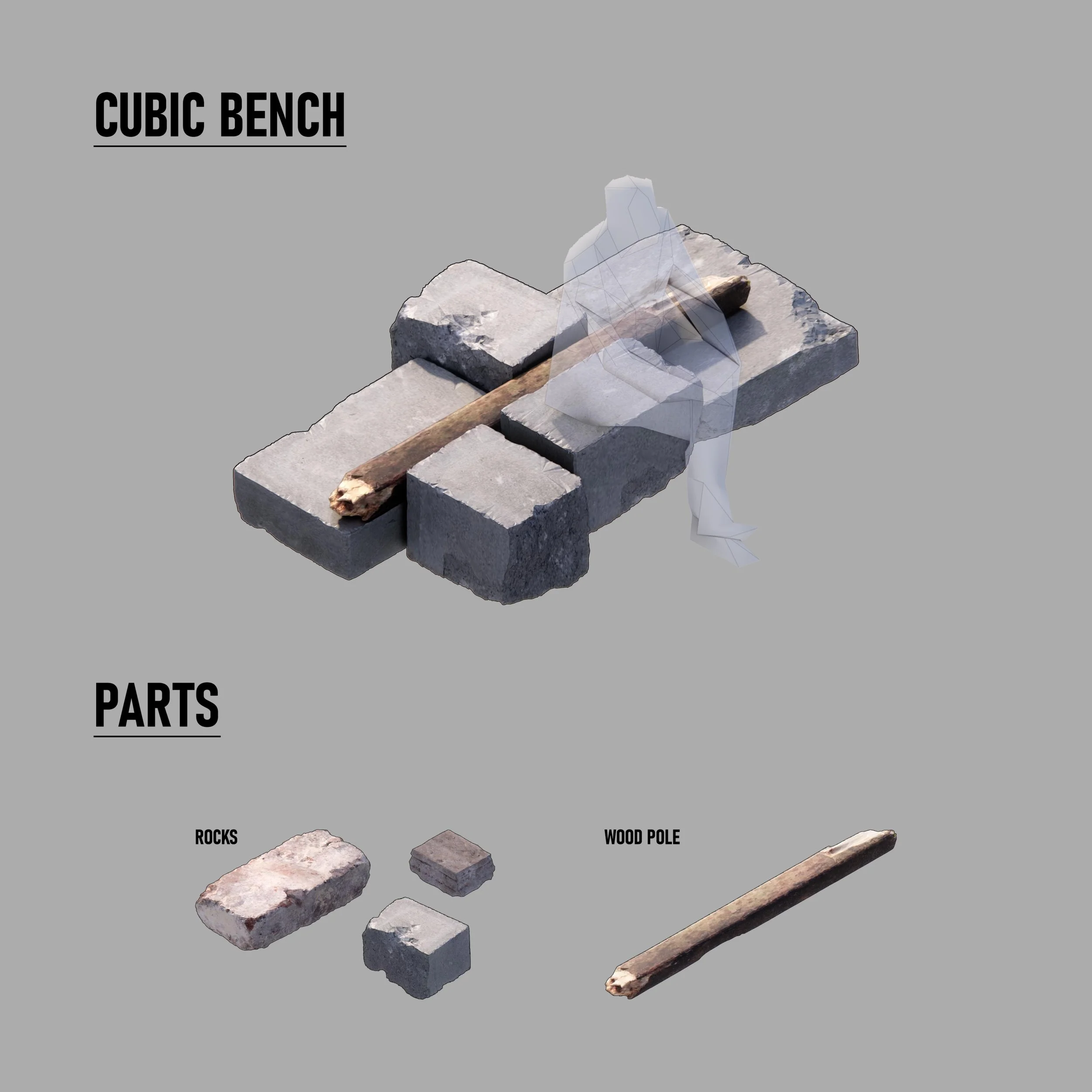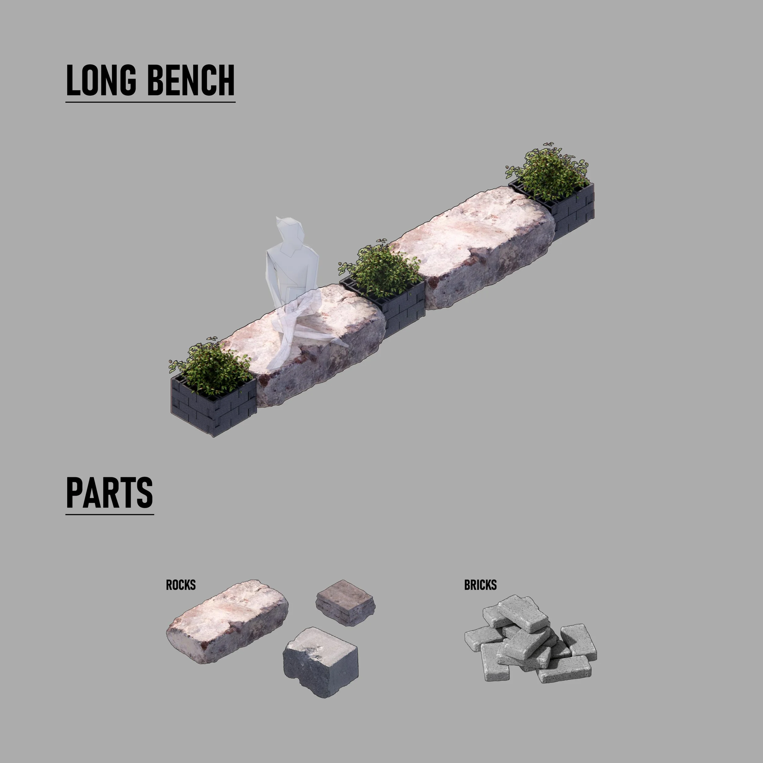 Through 3D modelling software, I arranged various materials that could be found and got a series of combinations. When assembling them, I consciously divided them into small, medium, and large structures to ensure space diversity and adaptability to the environment. These designs range from small units, such as a long bench that can accommodate one to four people, to community spaces that can accommodate more than a dozen people.